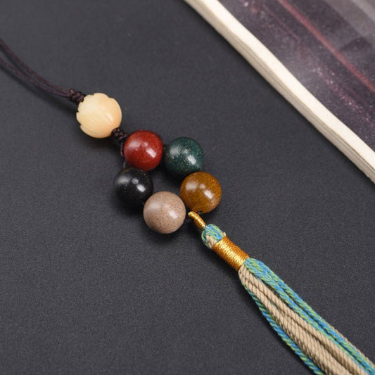 Bead Colors: Red, Green, Black, Yellow, and Brown (representing the Five Elements)
