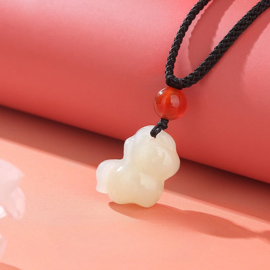 $69.99This elegant Chinese zodiac horse jade necklace features a hand-carved natural Hetian jade horse, paired with a vibrant red agate bead and a durable braided cord. Inspired by traditional Chinese symbolism, the horse represents success, momentum, good fortune, and safe journeys, making this necklace a meaningful talisman for everyday wear.