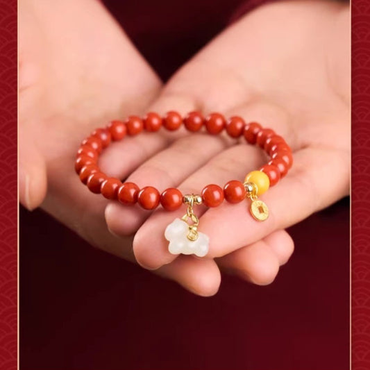 The centerpiece of this bracelet is the lustrous red agate bead. Red agate is renowned for its vibrant color and is believed to bring strength, courage, and protection. Each bead is carefully selected for its quality and beauty, adding a touch of luxury to the bracelet. Complementing the red agate are charming peach - themed elements. The peach, in many cultures, symbolizes longevity, good luck, and prosperity, enhancing the positive energy of the bracelet.