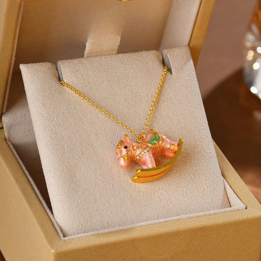 $49.99This beautifully crafted Chinese Zodiac Enamel Rocking Horse Necklace is a charming piece that blends traditional craftsmanship with a playful, modern design. Featuring a delicate pink macaron shade with a glossy finish and high-temperature enamel, the necklace is detailed with intricate gold accents that bring out the elegance and fun of the piece.