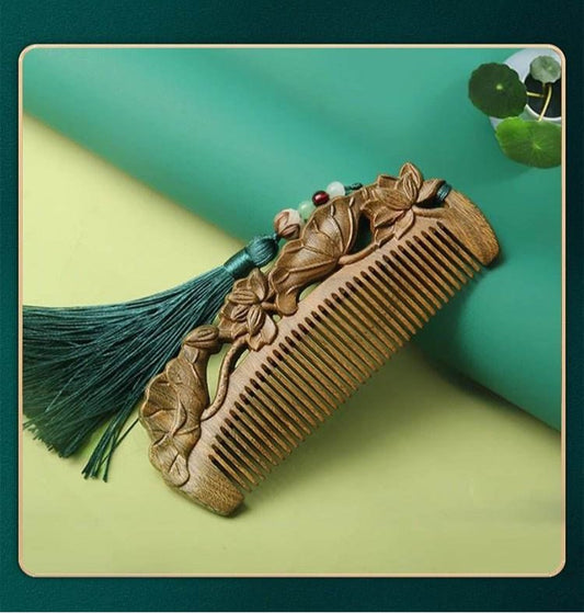 Vintage Green Sandalwood Comb with Lotus Carving - Portable Mini Hair Comb - Perfect Gift