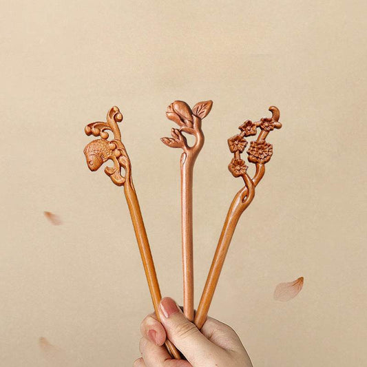 This hairpin belongs to the jewelry category. Made of red sandalwood with peach wood elements, finely carved with vintage designs. Ideal for Hanfu bun styling, it also comes in a sandalwood gift box, perfect as a high - end gift for girlfriends. With smooth texture and stable styling, it combines traditional charm and modern aesthetics.