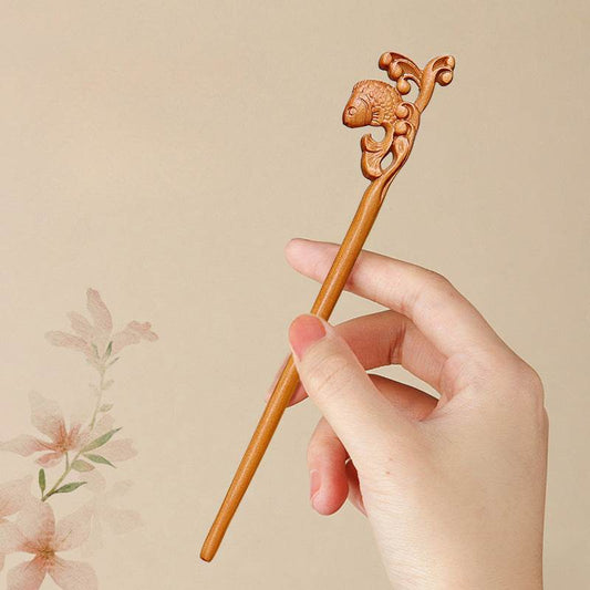 This hairpin belongs to the jewelry category. Made of peach wood and green sandalwood, designed with vintage elements and hand - carved for exquisite patterns like flowers and fish. Peach wood is skin - friendly and stable for hairstyling. Ideal for Hanfu matching, daily bun styling, or gifting to girlfriends on festivals, this chinese hairpin shows unique oriental charm as a practical and aesthetic accessory.