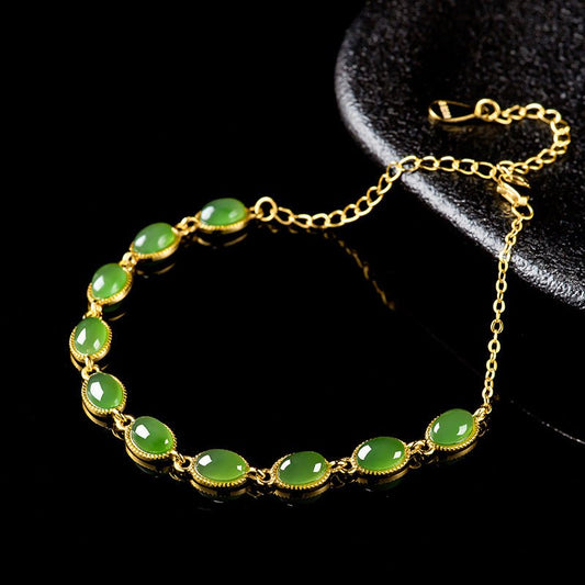 Hetian jade is known for its smooth texture and deep, calming green color. It has long been revered in Chinese culture for its symbolism of prosperity, health, and peace. Wearing jade is believed to bring good fortune and balance to the wearer.