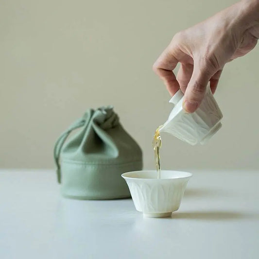 This product belongs to the tea ware category, crafted with Ding Kiln technology. The lotus petal design is exquisite and elegant, showing oriental aesthetics. The mini one - person set includes a lotus petal gaiwan and cup, paired with a portable storage bag. Made of fine - textured Ding Kiln material with warm glaze, it’s ideal for outdoor travel, camping, home solo drinking, or office breaks, creating a tea - tasting ritual easily. The small capacity fits single - person needs, perfectly combining traditional craftsmanship with modern portable design.