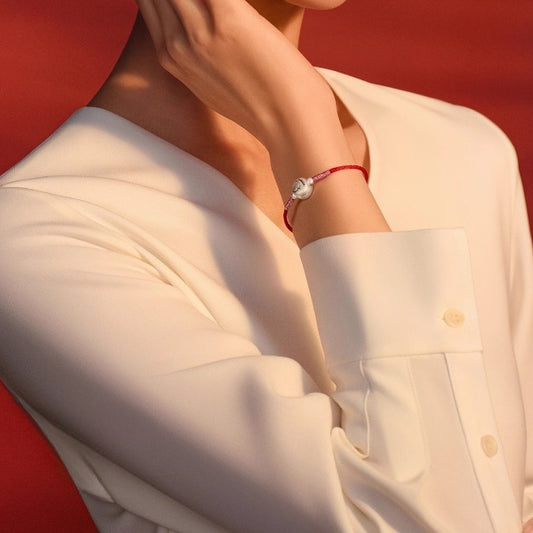 ¥14,200This elegant Chinese zodiac horse silver bracelet blends traditional symbolism with a sweet, modern design. Handcrafted with S925 sterling silver and a woven red string, the bracelet features a smooth natural Hetian jade cloud charm, paired with delicate heart and bow pendants finished in soft enamel tones.